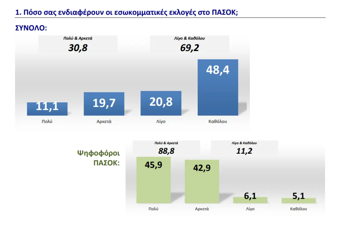 Η τελευταία δημοσκόπηση της GPO πριν τον Α’ γύρο των εσωκομματικών εκλογών του ΠΑΣΟΚ καταγράφει το τεράστιο ενδιαφέρον της εκλογικής βάσης του ΠΑΣΟΚ, που απ’ ότι φαίνεται, θα προσέλθει μαζικά στην κάλπη της Κυριακής, ενώ ενδιαφέρον υπάρχει και από το 30,8% της ευρύτερης κοινής γνώμης. Όπως ήδη έχουμε επισημάνει, το ύψος της συμμετοχής και η σύνθεση του εκλογικού σώματος θα επηρεάσει σε μεγάλο βαθμό το συσχετισμό δυνάμεων, κανείς όμως δεν μπορεί με ακρίβεια να το προσδιορίσει.