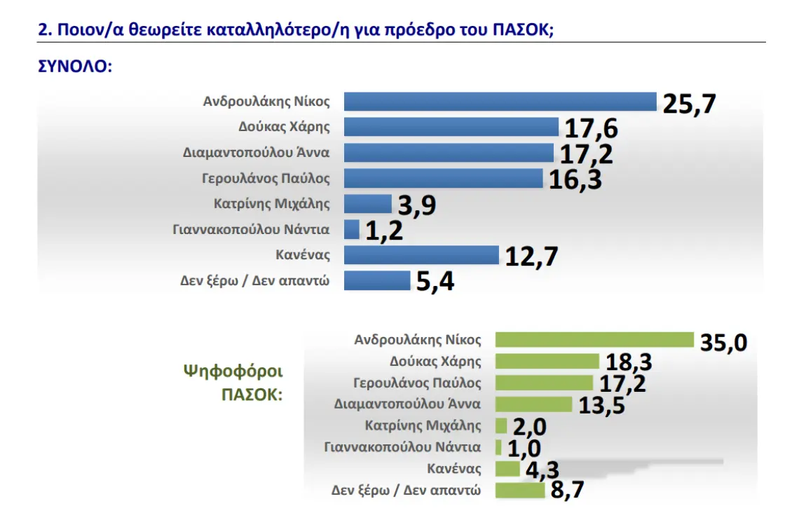 Όπως αποτυπωνόταν σε όλη την προεκλογική περίοδο, ο κ. Ανδρουλάκης συνεχίζει και σε αυτή τη μέτρηση να συγκεντρώνει το υψηλότερο ποσοστό προτιμήσεων τόσο στην πρόθεση ψήφου όσο και στους υπόλοιπους βασικούς δείκτες, που είναι η καταλληλότητα για την προεδρία και η παράσταση νίκης. Συγκριμένα, ο νυν πρόεδρος του ΠΑΣΟΚ θεωρείται καταλληλότερος από το 25,7% του συνόλου και από το 35% των ψηφοφόρων του ΠΑΣΟΚ.