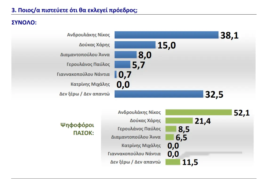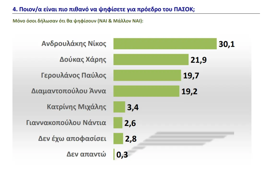 Προβάδισμα που αποτυπώνεται και στον πίνακα της πρόθεσης ψήφου όπου ο κ. Ανδρουλάκης με 30,1% οδηγεί την κούρσα με τον κ. Δούκα να ακολουθεί στη δεύτερη θέση με 21,9%, έχοντας, ωστόσο, σε κοντινή απόσταση τον κ. Γερουλάνο που με 19.7% δείχνει μετά το ενισχυμένος και την κ. Διαμαντοπούλου με 19,2%.