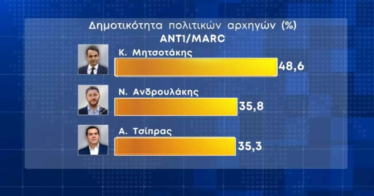 Αναφορικά με την δημοτικότητα των πολιτικών αρχηγών και εδώ ο Κυριάκος Μητσοτάκης είναι μπροστά με 48,6% και ακολουθούν ο Νίκος Ανδρουλάκης με 35,8% και ο Αλέξης Τσίπρας με 35,3%. Στη συνέχεια ο Δημήτρης Κουτσούμπας με 27,6%, ο Γιάνης Βαρουφάκης με 23,8% και ο Κυριάκος Βελόπουλος με 16,4%.