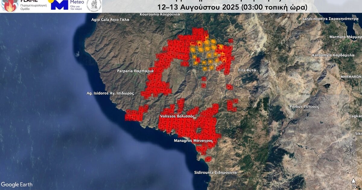 Τα θερμά σημεία ανίχνευσε το όργανο VIIRS (Visible Infrared Imaging Radiometer Suite) των δορυφόρων πολικής τροχιάς SUOMI, NOAA-20 και NOAA-21 στις 03:00 τοπική ώρα Ελλάδας της 13ης Αυγούστου 2025.