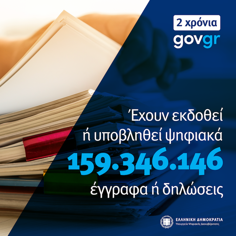 - 159.346.146 έγγραφα ή δηλώσεις έχουν εκδοθεί/υποβληθεί ηλεκτρονικά