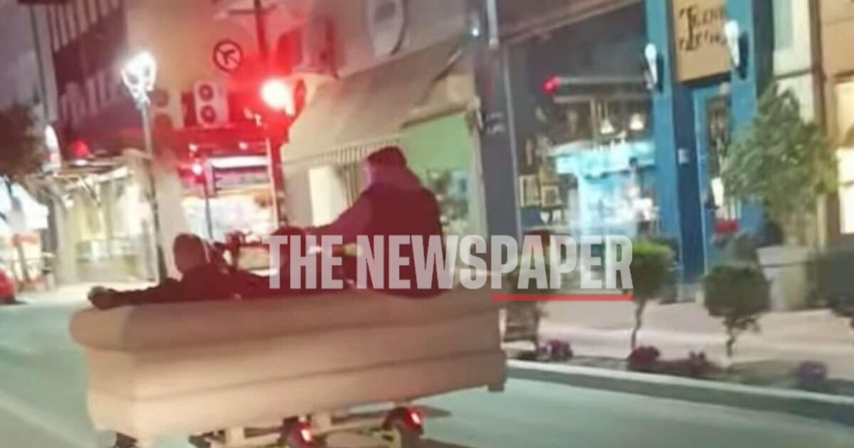 Τοποθέτησαν επάνω στα πατίνια μια ξύλινη παλέτα, και πάνω στην παλέτα έβαλαν έναν καναπέ (!) μετατρέποντάς τα σε μια «κινητή πλατφόρμα ψυχαγωγίας», με την οποία άρχισαν να περιφέρονται στους δρόμους του Βόλου, γελώντας, φωνάζοντας και καταγράφοντας πιθανόν το «κατόρθωμά» τους με τα κινητά τους τηλέφωνα.