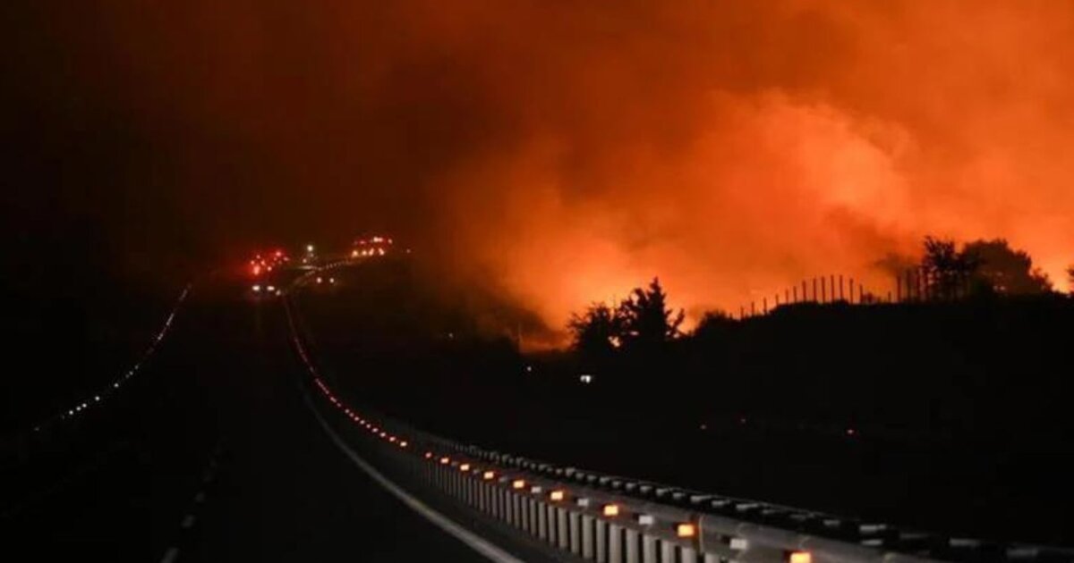 Κοντά στον οικισμό Αύρα, που εκκενώθηκε νωρίτερα με μήνυμα του 112, μαίνονται διάσπαρτες εστίες.