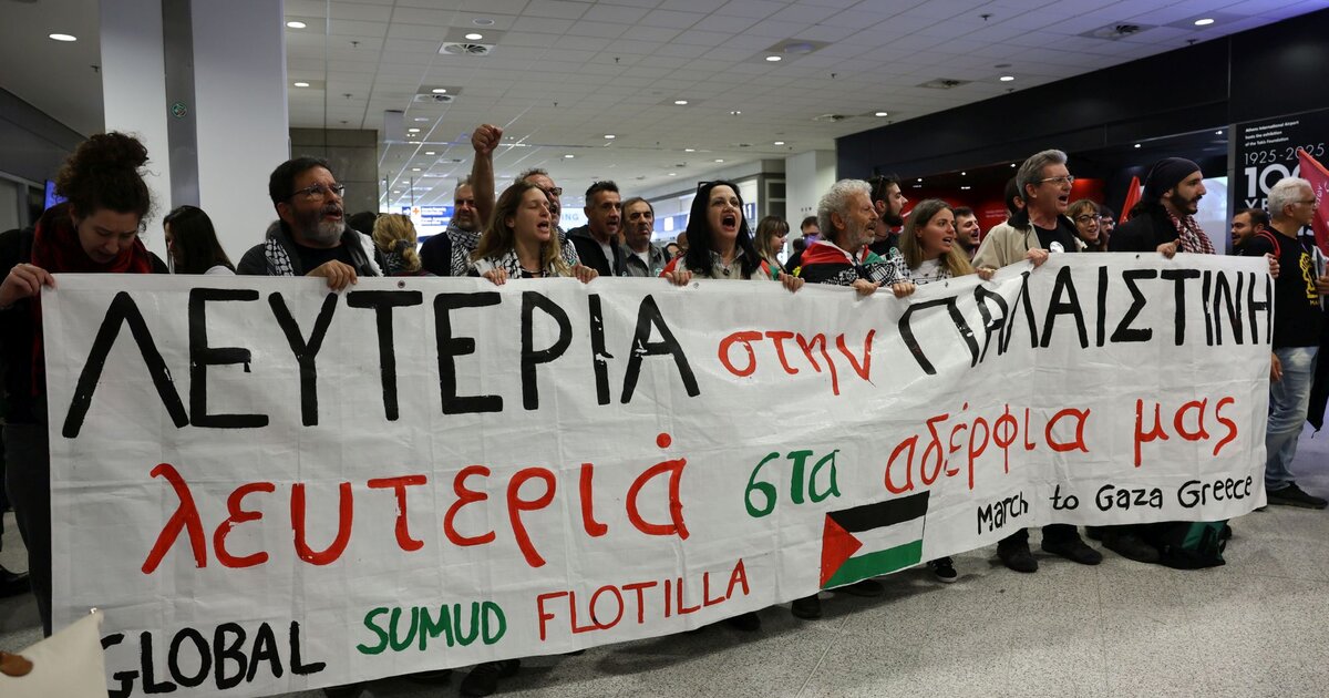 Με πανό, πλακάτ και σημαίες της Παλαιστίνης, δεκάδες άνθρωποι υποδέχτηκαν τους 27 Έλληνες που συμμετείχαν στην αποστολή ανθρωπιστικής βοήθειας του Global Sumud Flotilla στη Γάζα, οι οποίοι έφτασαν το απόγευμα της Δευτέρας (06.10.2025) στο διεθνές αεροδρόμιο της Αθήνας, μετά από 3 μέρες κράτησης από τις αρχές του Ισραήλ.