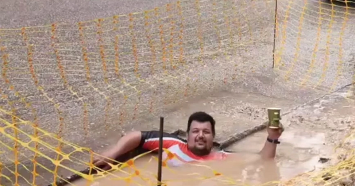 Στο βίντεο που δεν άργησε να γίνει viral, φαίνεται να παίρνει τον καφέ του και μαζί με την κλασσική φουσκωτή μπανάνα να βουτάει σε μια «πισίνα» που δημιουργήθηκε στον δρόμο σε λακκούβα έργων.