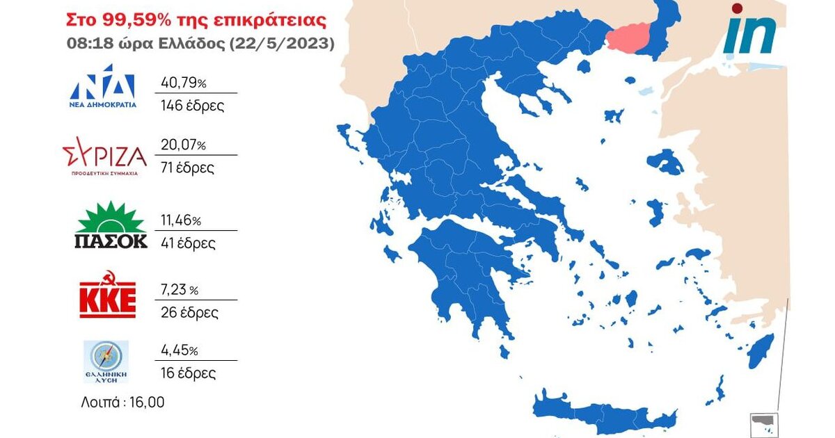 Λίγο μετά τις 08:00 το πρωί της Δευτέρας, και με την ενσωμάτωση των ψήφων να έχει φτάσει στο 99,59%, διαφαίνεται πλέον ξεκάθαρα η σαρωτική νίκη της Νέας Δημοκρατίας επί του ΣΥΡΙΖΑ με διαφορά άνω των 20 ποσοστιαίων μονάδων.