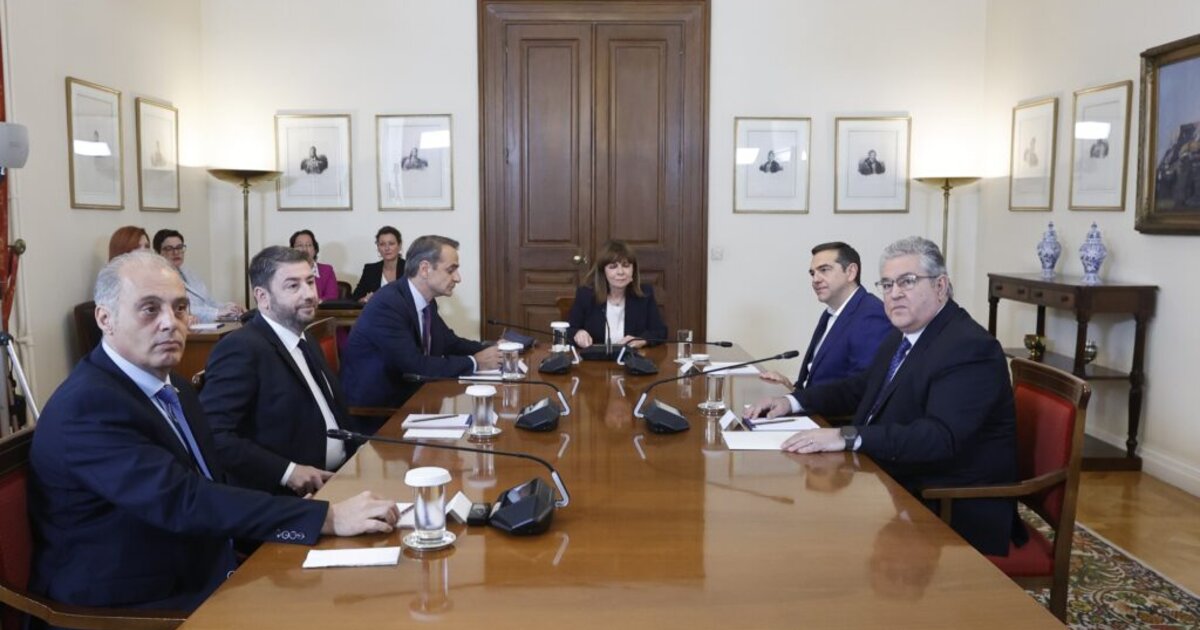 Ολοκληρώθηκε στις 10.30 το πρωί της Τετάρτης, στο Προεδρικό Μέγαρο, η σύσκεψη που συγκάλεσε η Πρόεδρος της Δημοκρατίας Κατερίνα Σακελλαροπούλου με τους αρχηγούς των κοινοβουλευτικών κομμάτων που επανεξελέγησαν, δηλαδή της ΝΔ Κυριάκο Μητσοτάκη, του ΣΥΡΙΖΑ-ΠΣ Αλέξη Τσίπρα, του ΠΑΣΟΚ Νίκο Ανδρουλάκη, του ΚΚΕ Δημήτρη Κουτσούμπα, της Ελληνικής Λύσης Κυριάκο Βελόπουλο, σύμφωνα με το άρθρο 37 παρ. 3 εδάφιο γ΄ του Συντάγματος.