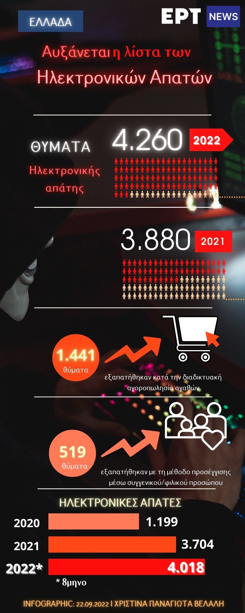 Σύμφωνα με το ρεπορτάζ του ertnews.gr και τα πρόσφατα στοιχεία της ελληνικής αστυνομίας, τα θύματα ηλεκτρονικής απάτης τους τελευταίους 8 μήνες του 2022 εκτοξεύθηκαν στα 4.260 θύματα στην Ελλάδα σε σχέση με το 2021 που είχαμε 3.880 θύματα. Χαρακτηριστικό είναι επίσης, πως το 2019 είχαμε 621 θύματα. Ακόμη, καταγράφηκαν οι μέθοδοι που χρησιμοποίησαν οι απατεώνες για να προσεγγίσουν και να εξαπατήσουν τα θύματα τους. Ειδικότερα, «στην παγίδα» πέσανε 1.441 άτομα κατά την διαδικτυακή αγοροπωλησία αγαθών και με τη μέθοδο προσέγγισης μέσω συγγενικού/φιλικού προσώπου 519. Επίσης, παρατηρήθηκε από το 2020 μέχρι σήμερα, μια μεθοδική αύξηση των ηλεκτρονικών απατών, γεγονός το οποίο μας δείχνει και το πόσο ισχυροί έχουν γίνει οι κυβερνοαπατεώνες, καθώς ευφευρίσκουν διαρκώς νέες μεθόδους και τεχνικές, περιορίζοντας λάθη και απροσεξίες, εξαπατόντας, με αυτό τον τρόπο, όλο και περισσότερους πολίτες.