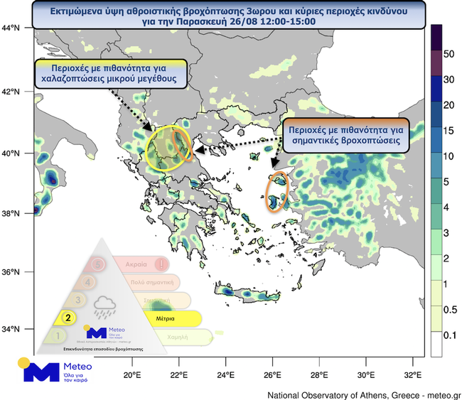 Η παρακάτω ομάδα χαρτών δείχνει τον αθροιστικό υετό 3ώρου που αναμένεται κατά την διάρκεια της Παρασκευής 26/08 μεταξύ 12:00-15:00 (Γραφικό 1) και 15:00-18:00 (Γραφικό 2) και συνοψίζει τις κυριότερες περιοχές κινδύνου.