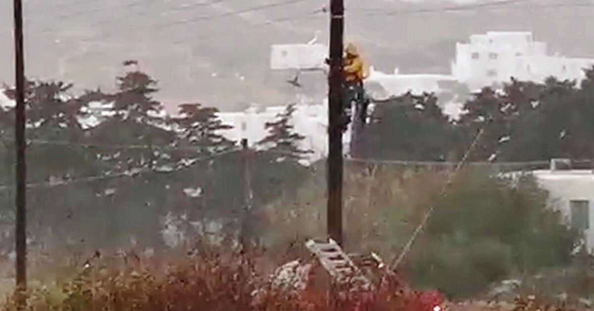 Το πρωί της Κυριακής 6 Νοεμβρίου και ενώ στην Πάρο έπεφτε ισχυρή βροχή, εναερίτες της ΔΕΗ ήταν σκαρφαλωμένοι σε ψηλό στύλο προκειμένου να επιδιορθώσουν βλάβη στο δίκτυο.