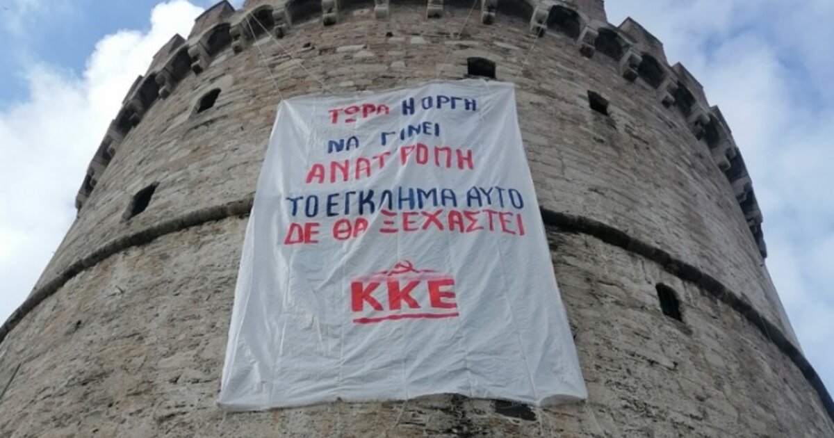 Ενταση προκλήθηκε νωρίτερα στη Θεσσαλονίκη, όταν μέλη του ΚΚΕ, με επικεφαλής τον βουλευτή Α' Θεσσαλονίκης, Γιάννη Δελή, ανάρτησαν στον Λευκό Πύργο πανό διαμαρτυρίας για την τραγωδία στα Τέμπη.