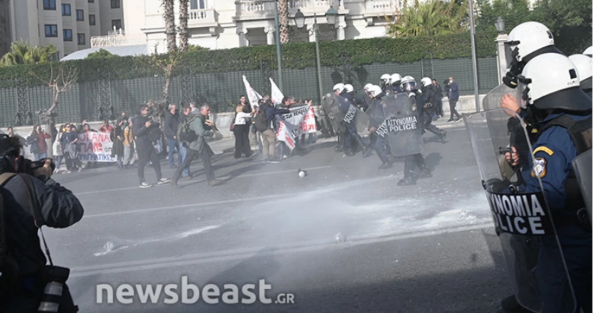 Οι διαδηλωτές, όπως μεταδίδει το newsbeast.gr, επιχείρησαν να περάσουν στη Βουλή και εμποδίστηκαν από τη διμοιρία των ΜΑΤ, η οποία έκανε χρήση χημικών.