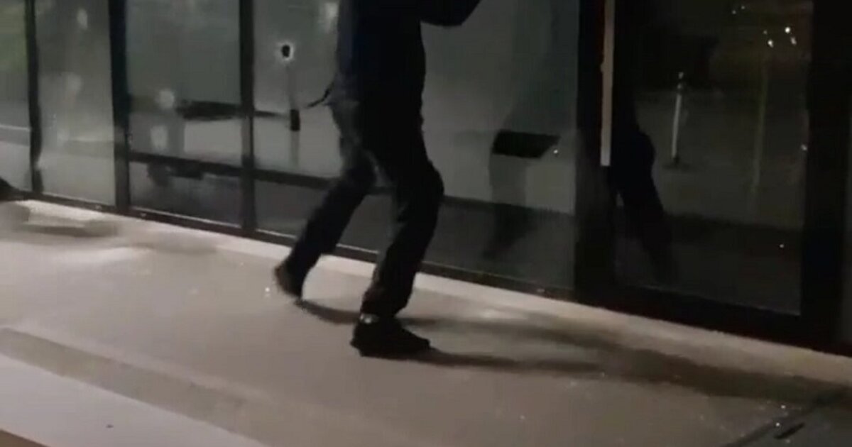 Στο βίντεο διακρίνονται δύο άτομα με κουκούλες να χτυπούν και να σπάνε με βαριοπούλα την τζαμαρία της επιχείρησης