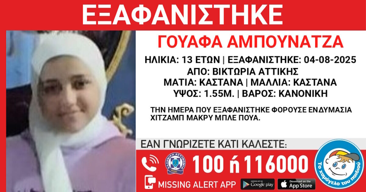 Την εξαφάνιση της 13χρονης Γουάφα Αμπουνάτζα, γνωστοποίησε το «Χαμόγελο του Παιδιού». Με ανακοίνωσή του το βράδυ της Δευτέρας (04.08.2025), σημειώνει ότι η ανήλικη παλαιστινιακής καταγωγής χάθηκε από την περιοχή της Βικτώριας.