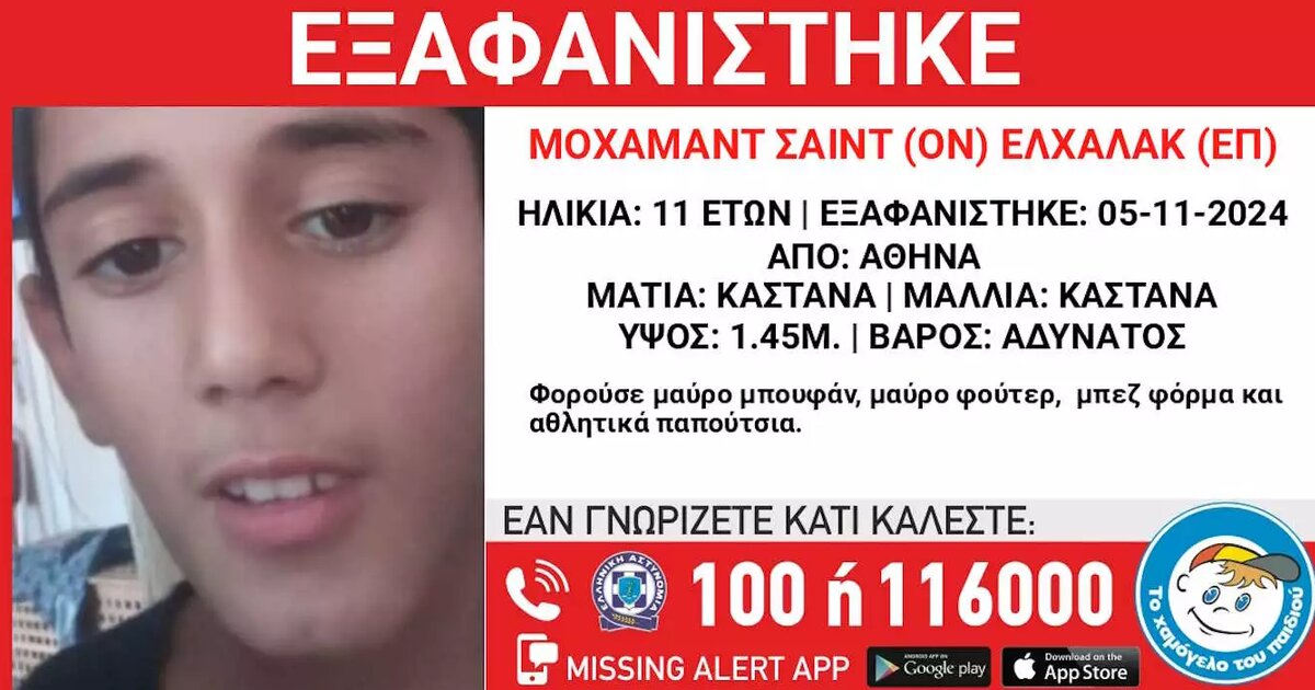 Μεγάλη κινητοποίηση σήμανε στις Αρχές για την εξαφάνιση ενός 11χρονου από την Αθήνα. Πρόκειται για τον Μοχάμαντ Σαΐντ Ελχαλάκ (Mohammad Saeed Elhalak), συριακής καταγωγής, όπως ανακοίνωσε το «Χαμόγελο του Παιδιού».