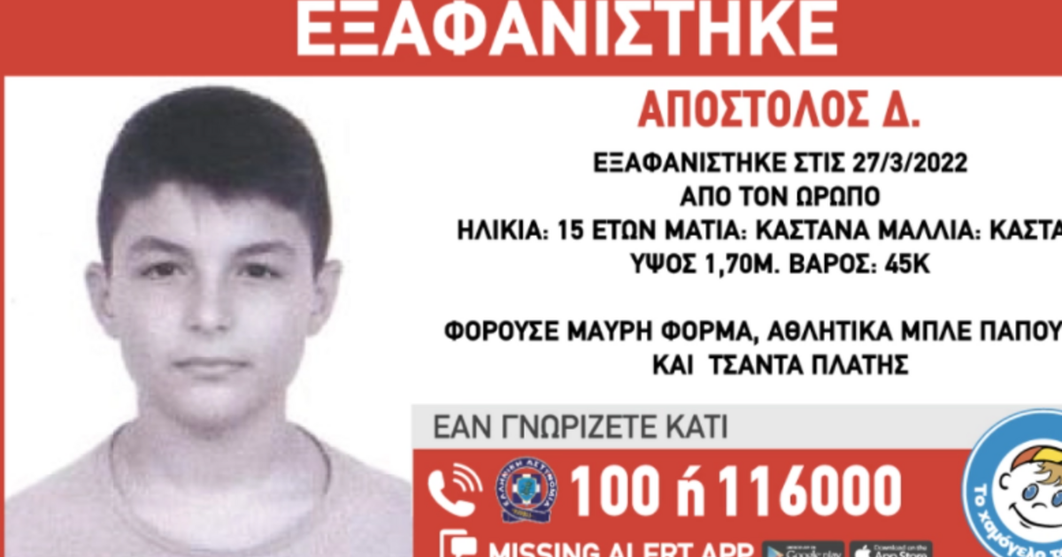 Εξαφανίστηκε χθες Κυριακή 27 Μαρτίου κατά τις απογευματινές ώρες από την περιοχή του Ωρωπού, ο Απόστολος Δ., 15 ετών.