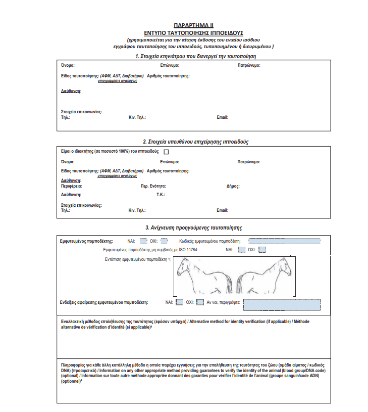 Στο ΦΕΚ περιλαμβάνεται η αίτηση για χορήγηση έγκρισης ενέσιμων πομποδεκτών και το έντυπο ταυτοποίησης.