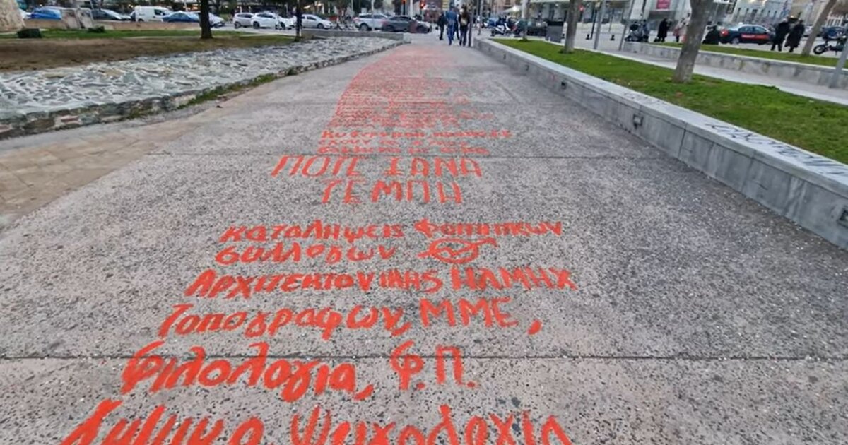 Μέλη φοιτητικών συλλόγων έγραψαν με κόκκινο χρώμα τα ονόματα των θυμάτων. «Ποτέ ξανά Τέμπη» αναφέρουν φοιτητές της Σχολής Αρχιτεκτονικής, Ηλεκτρολόγων Μηχανικών, Τοπογράφων, ΜΜΕ, Φιλολογίας, Χημικού και Ψυχολογίας.