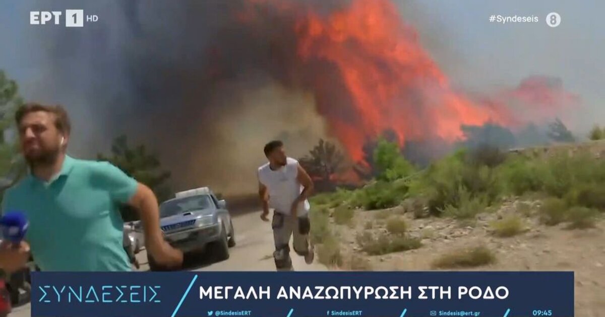 Στο βίντεο φαίνονται ο απεσταλμένος της ΕΡΤ στο φλεγόμενο νησί, Κώστας Νούσης, ο οπερατέρ Γιώργος Κορδονούλης και η ηχολήπτρια Παναγιώτα Δερβιτσιώτη με φόντο τις απειλητικές φλόγες του πύρινου μετώπου που μαίνεται δίπλα στο Βάτι της Ρόδου.