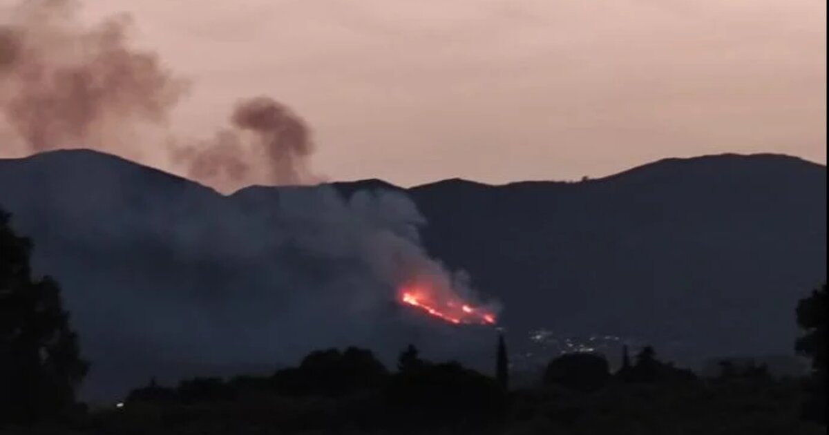 Σύμφωνα με πληροφορίες της Πυροσβεστικής, η φωτιά καίει σε δύσβατο σημείο.