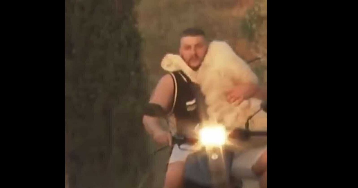 Το συγκλονιστικό καρέ τράβηξε ο Θανάσης Σταυράκης για το AP. Ο νεαρός, ιδρωμένος, κρατά σφιχτά στην αγκαλιά του το πρόβατο ενώ οδηγεί το μηχανάκι του για να το απομακρύνει από την τεράστια φωτιά που κατέστρεψε την Αχαΐα. Πίσω του φαίνονται καπνοί… η ατμόσφαιρα είναι αποπνικτική.