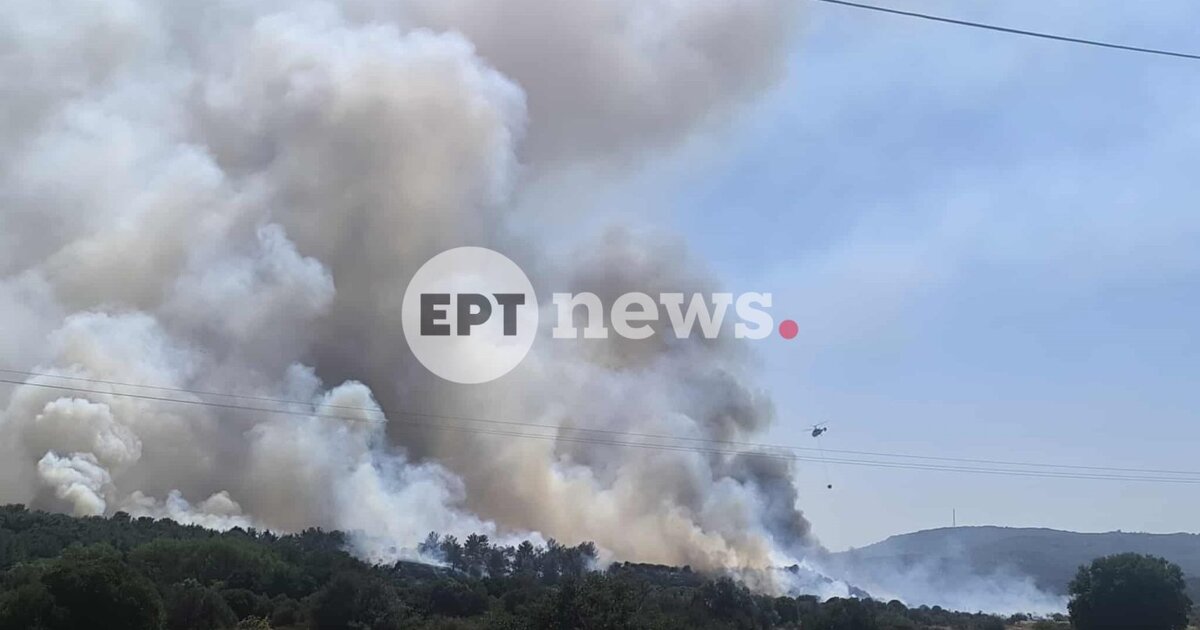 Με μήνυμα από το 112 νωρίτερα ενημερώθηκαν οι κάτοικοι να βρίσκονται σε ετοιμότητα. Η φωτιά ξεκίνησε από χόρτα και επεκτάθηκε στο δάσος και προς το παρόν δεν απειλείται οικισμός.
