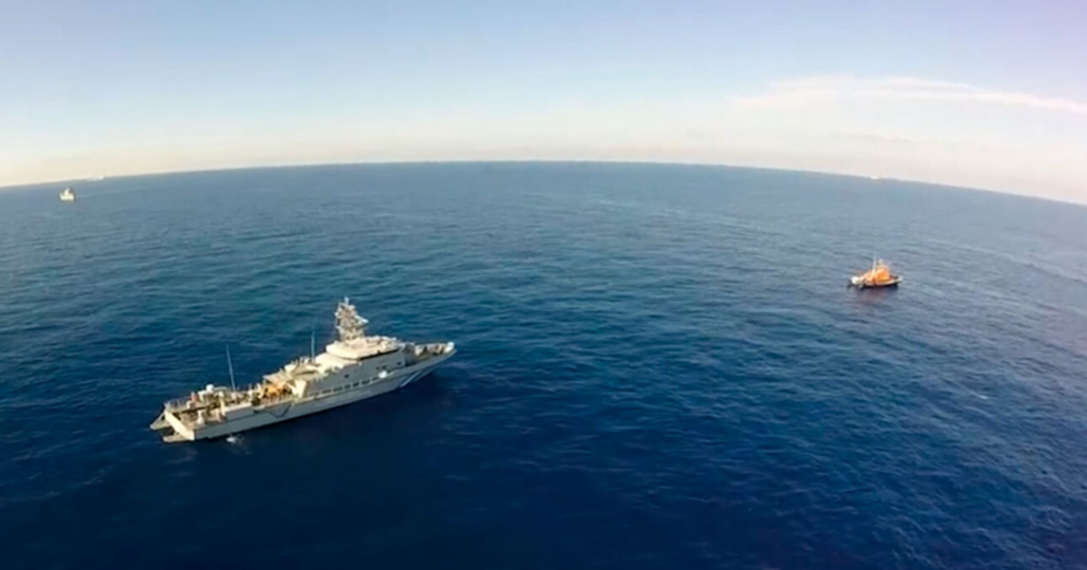 Η κάμερα από το ελικόπτερο του Πολεμικού Ναυτικού καταγράφει τη στιγμή που σκάφος του Λιμενικού Σώματος πλησιάζει το σημείο στο οποίο συνέβη το πολύνεκρο ναυάγιο