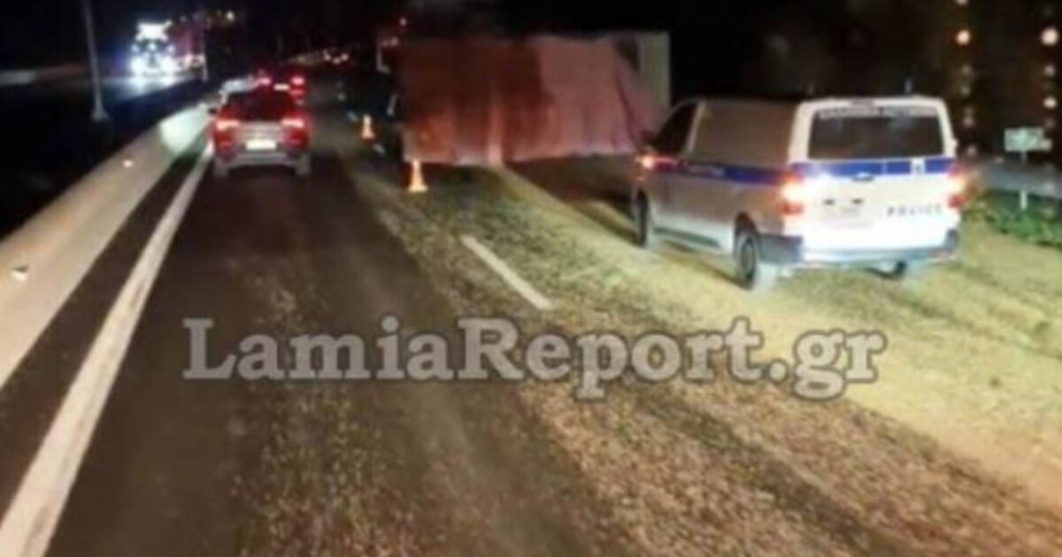 Η εκτροπή - ανατροπή του φορτηγού έγινε στις 9:00΄ το βράδυ της Τρίτης, στο 197χλμ της εθνικής οδού, λίγο πριν τα διόδια της Αγίας Τριάδας, στο ρεύμα προς Αθήνα.