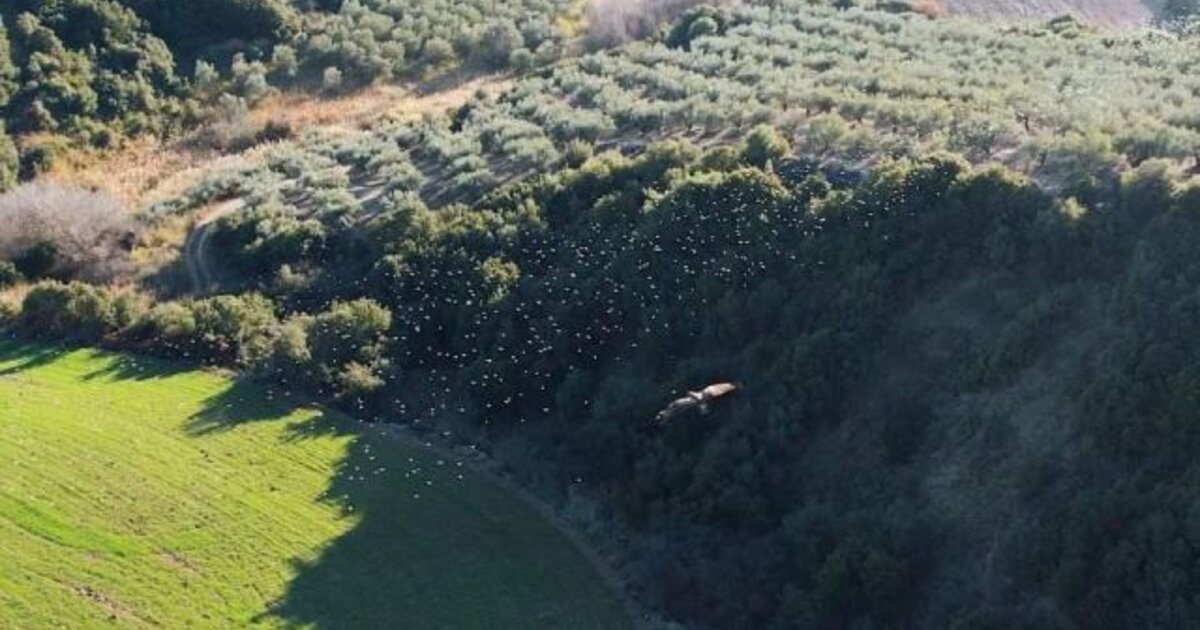 Ο Δημήτρης Μερμίγκης κατάφερε με το drone του να καταγράψει μοναδικές εικόνες από την επίθεση γερακιών σε σμήνος από μαυροπούλια.