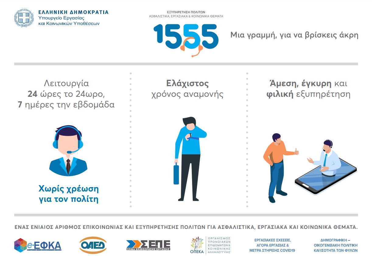 Η ενιαία γραμμή 1555 ξεκίνησε πιλοτικά τη λειτουργία της τον περασμένο Ιούλιο, με σκοπό να βελτιωθεί ουσιαστικά η εξυπηρέτηση των πολιτών και να αντιμετωπιστούν χρόνια προβλήματα στην επικοινωνία με οργανισμούς όπως ο ΕΦΚΑ. Το νέο τηλεφωνικό κέντρο ενοποιεί διάσπαρτα τηλεφωνικά κέντρα που λειτουργούσαν ως τώρα στο υπουργείο, χωρίς μεταξύ τους διασύνδεση. Οι πολίτες μπορούν να καλούν στο 1555 χωρίς χρέωση, 24 ώρες το 24ωρο και με ελάχιστο χρόνο αναμονής, για να ζητήσουν πληροφορίες, να υποβάλλουν αιτήματα και να διευθετήσουν εκκρεμείς υποθέσεις τους.