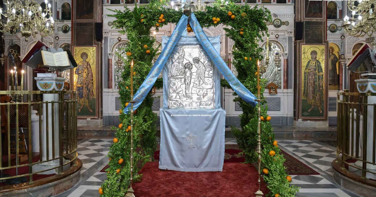 Την παραμονή των Θεοφανίων οι ενορίτες του Αγίου Γεωργίου συγκεντρώνονται στο Ναό και στολίζουν την εικόνα της Βαπτίσεως από το δάπεδο μέχρι τον τρούλο του Ναού, με μυρσινιές και τα ξακουστά χιώτικα μανταρίνια, αναπαριστώντας έτσι τη Βάπτιση του Ιησού στον Ιορδάνη ποταμό.