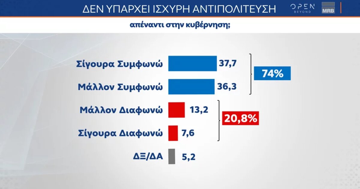 Χωρίς αντιπολίτευση είναι η κυβέρνηση της ΝΔ και ο Κυριάκος Μητσοτάκης, όπως αποτυπώνει το β' μέρος της δημοσκόπησης της MRB για το Open.
