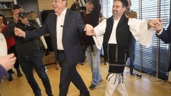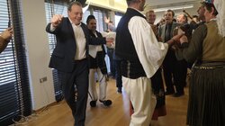 Στη συνέχεια, σε μια συγκινητική στιγμή, χορευτές της Πανηπειρωτικής Συνομοσπονδίας θυμήθηκαν ανθρώπους που δε βρίσκονται κοντά τους, είτε γιατί έχουν χαθεί είτε γιατί είναι ξενιτεμένοι, και τραγούδησαν με τον πολυφωνικό τρόπο το γνωστό ηπειρώτικο τραγούδι «Αλησμονώ και χαίρομαι». Η επίσκεψη έκλεισε με παραδοσιακούς χορούς και τραγούδια με τον Σωκράτη Φάμελλο να αποδέχεται την πρόσκληση των χορευτών και να πιάνεται στον κύκλο.