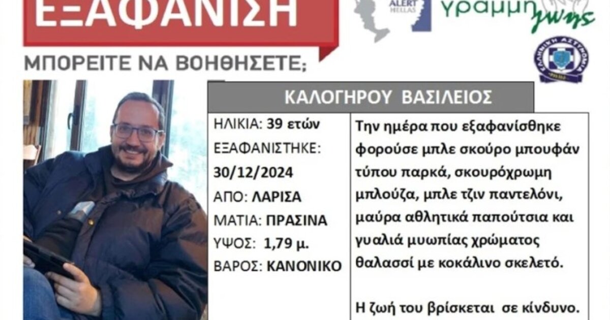 Ο Βασίλης Καλογήρου εξαφανίστηκε στις 30 Δεκεμβρίου 2024 ενώ βρισκόταν στη Λάρισα για τις γιορτές των Χριστουγέννων