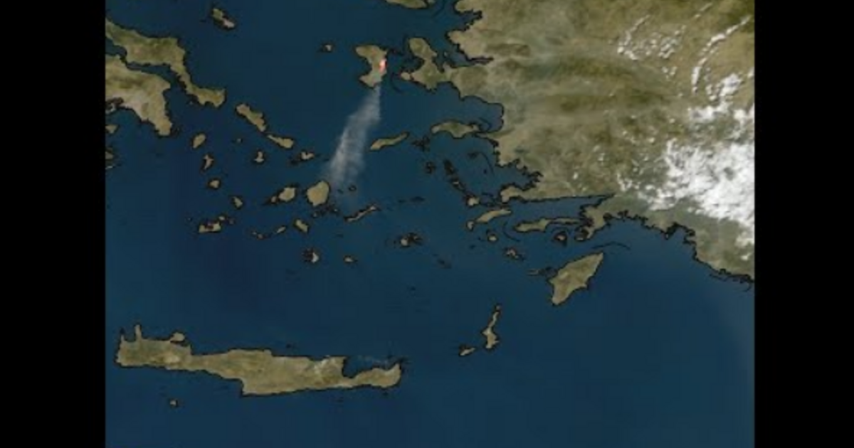 Οι καπνοί από την πύρινη λαίλαπα στο νησί του βορείου Αιγαίου φτάνουν μέχρι τις Κυκλάδες, όπως καταγράφηκε από τον γεωστατικό δορυφόρο τρίτης γενιάς Meteosat-12 της Ευρώπης.