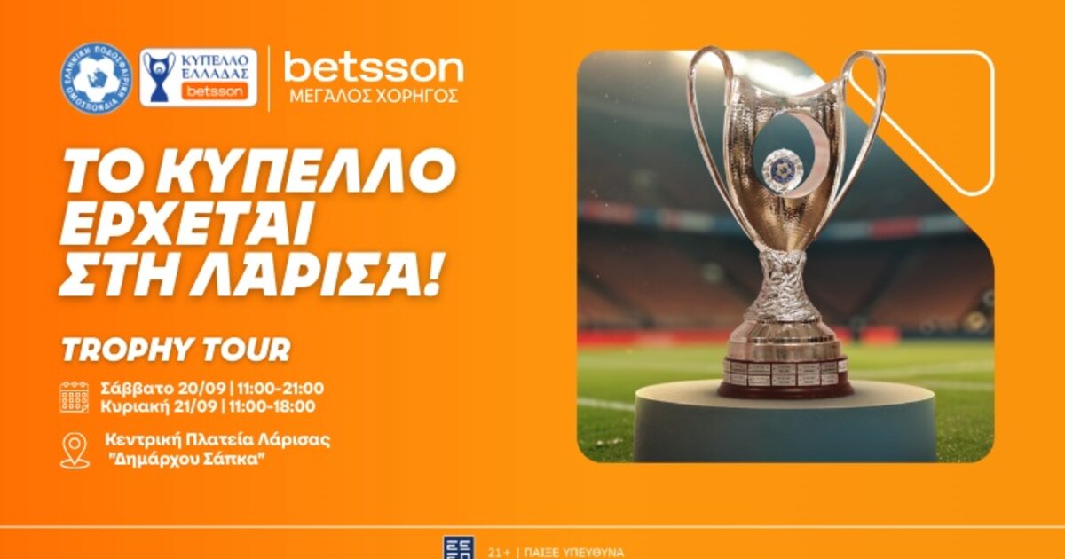 Με το βλέμμα στραμμένο στη νέα σεζόν και το νέο format του Κυπέλλου Ελλάδας Betsson, το Trophy Tour επιστρέφει δυναμικά και πιο ανανεωμένο από ποτέ. Η μεγάλη γιορτή του ποδοσφαίρου ξεκινάει και φέτος το ταξίδι της ανά την Ελλάδα, με πρώτη στάση την καρδιά της Θεσσαλίας, τη Λάρισα.