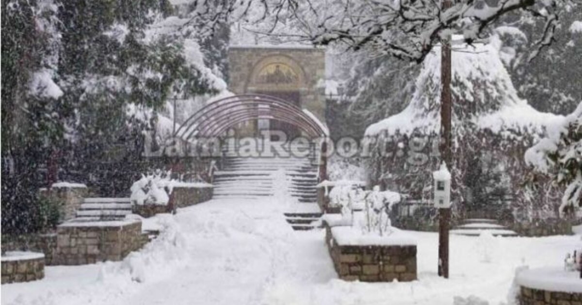 Ο λόγος για την ιστορική Μονή Αγάθωνος στην περιοχή της Υπάτης που από το πρωί του Σαββάτου χιονίζει και η φύση ζωγραφίζει.