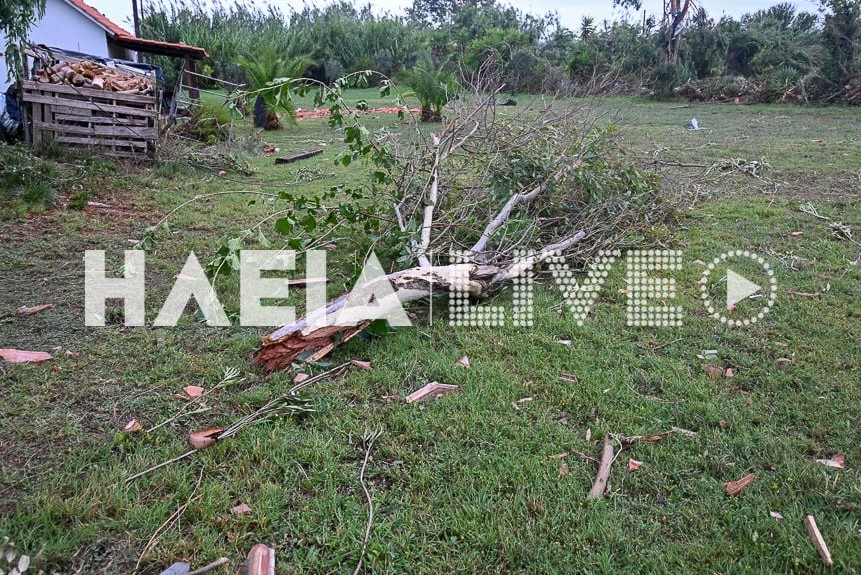 Ολόκληρα δέντρα διαλύθηκαν στο πέρασμα του ανεμοστρόβιλου που έπληξε την Ηλεία