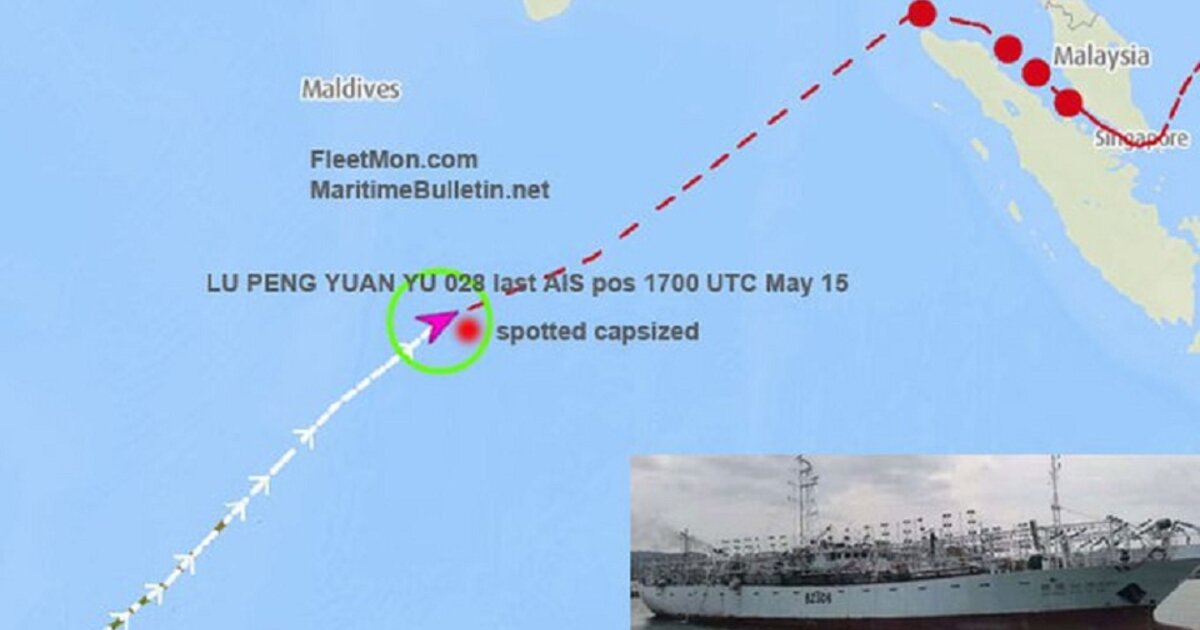 Το σκάφος, που ανήκει στην κινεζική εταιρεία Penglai Jinglu Fishery Co, αναποδογύρισε στις 03:00 της Τρίτης [τοπική ώρα· στις 22:00 της Δευτέρας ώρα Ελλάδας], σύμφωνα με την ίδια πηγή.