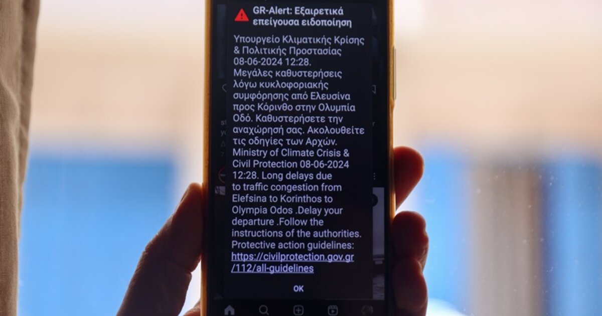 Ειδικότερα το μήνυμα αναφέρει: «Υπουργείο Κλιματικής Κρίσης & Πολιτικής Προστασίας 08-06-2024 12:28. Μεγάλες καθυστερήσεις λόγω κυκλοφοριακής συμφόρησης από Ελευσίνα προς Κόρινθο στην Ολυμπία Οδό. Καθυστερήσετε την αναχώρησή σας. Ακολουθείτε τις οδηγίες των Αρχών».
