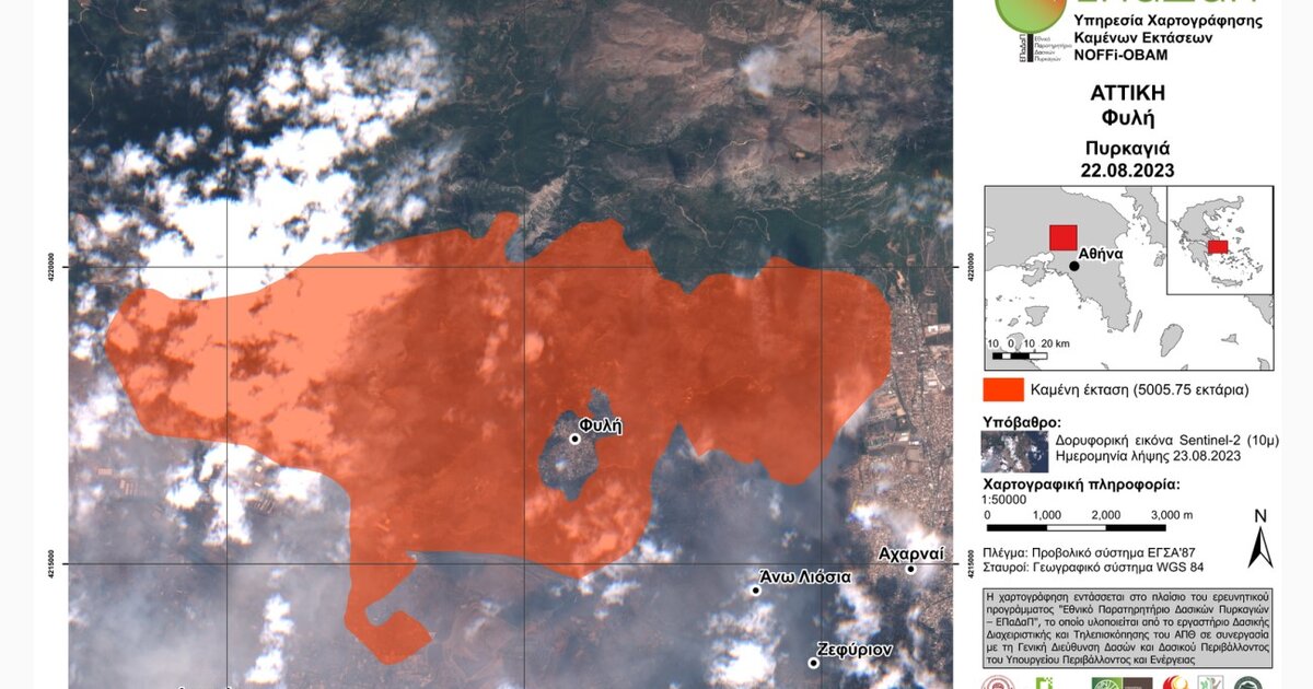 Πιο συγκεκριμένα, στους χάρτες που δημοσιεύει το ΑΠΕ-ΜΠΕ φαίνεται ότι οι καμένες εκτάσεις για τις περιοχές Φυλής του Νομού Αττικής και Αλεξανδρούπολης του Νομού Έβρου μέχρι τις 12 μ.μ. (23/08/2023) ανέρχονται στα 50.057 και 617.571 στρέμματα αντίστοιχα. Η χαρτογράφηση πραγματοποιήθηκε με δεδομένα Sentinel-2 (χωρικής διακριτικής ικανότητας 10μ.)