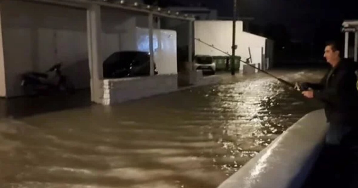 Η κακοκαιρία Bettina έβγαλε στη… στεριά ακόμη και καλαμάρι στην Μύκονο. Σε βίντεο φαίνεται ο ιδιοκτήτης γνωστού εστιατορίου του νησιού να ψαρεύει στον… δρόμο ο οποίος έγινε ένα με τη θάλασσα.
