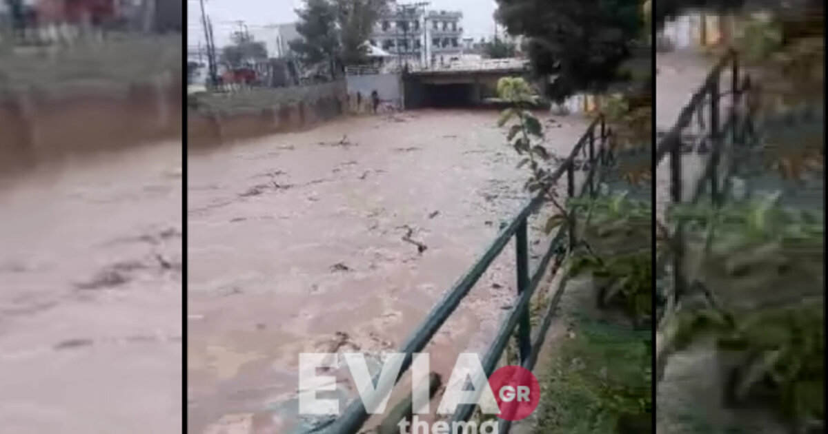 Στα Ψαχνά Ευβοίας μέσα σε μόλις λίγα λεπτά ο ποταμός Μεσσάπιος γέμισε με το νερό να απειλεί να ξεχειλίσει και να πλημμυρίσει η περιοχή.