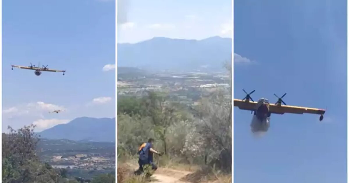 Καναντέρ στις Σέρρες αδειάζει νερό πάνω σε πυροσβέστες που τρέχουν να ξεφύγουν