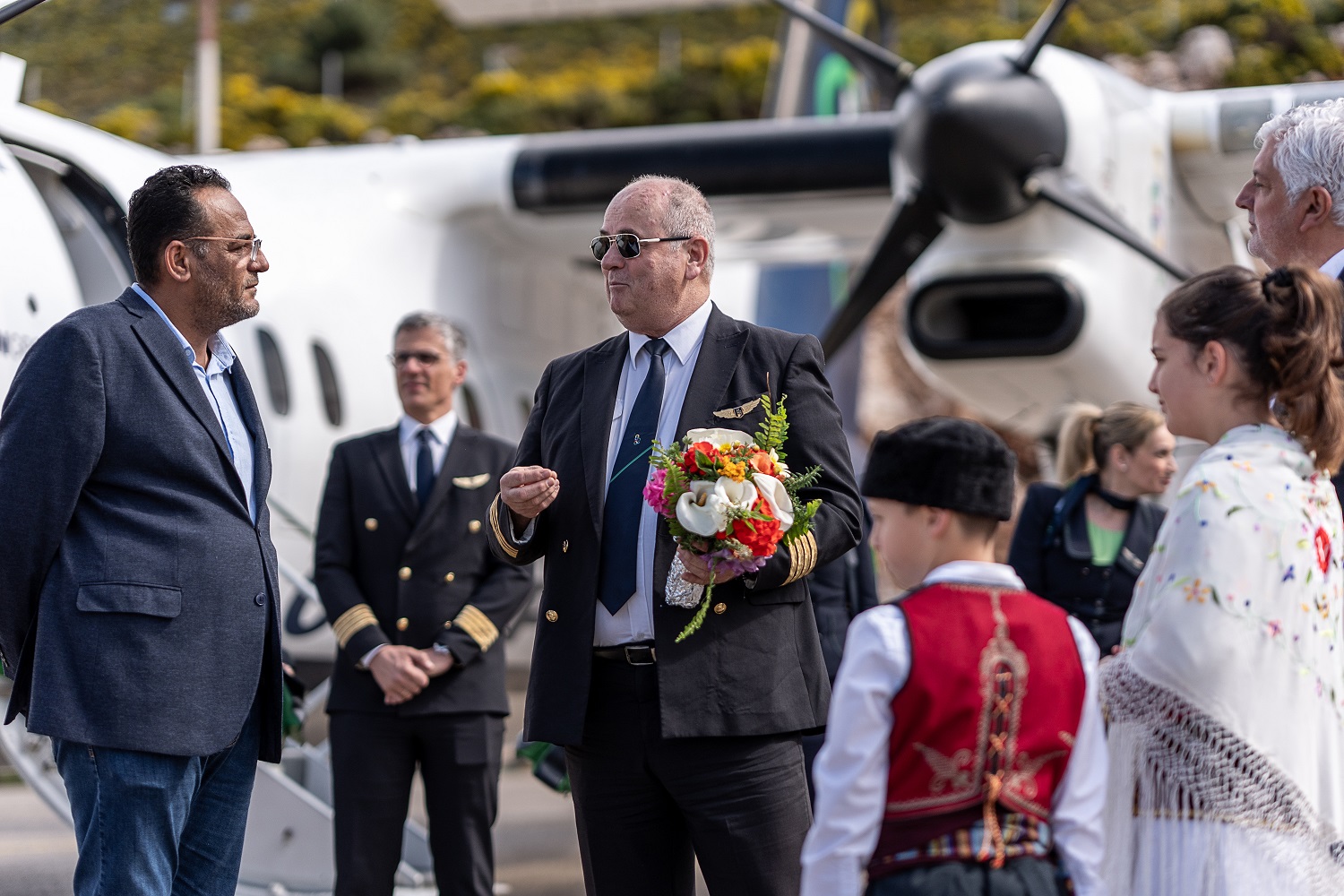 Κατά την άφιξη της πτήσης στο Καστελλόριζο, ο Δήμος Μεγίστης οργάνωσε μια ζεστή εκδήλωση, όπου ο Δήμαρχος κ. Νικόλαος Ασβέστης και ο Αντιδήμαρχος κ. Μιχαήλ Στρατής Αμύγδαλος απέδωσαν τιμητική διάκριση στην Olympic Air και τον Κυβερνήτη Μαζαράκη, αναγνωρίζοντας τον κρίσιμο ρόλο τους στη συνδεσιμότητα του νησιού. Στο πλαίσιο της ιδιαίτερης γιορτής, παιδιά του νησιού, ντυμένα με παραδοσιακές φορεσιές, υποδέχθηκαν τον Captain με λουλούδια και τοπικά κεράσματα, σε ένδειξη ευγνωμοσύνης.