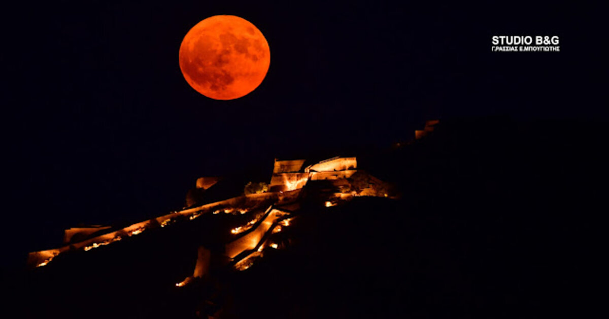 Κατακόκκινη η πανσέληνος του Αυγούστου πάνω από το Ναύπλιο - Βίντεο