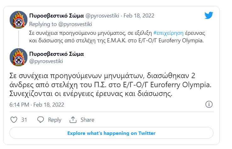 Οι προσπάθειες εντοπισμού αγνοουμένων συνεχίζονται. Οι άνδρες της 1ης ΕΜΑΚ έφτασαν με ελικόπτερο του Πολεμικού Ναυτικού και, φορώντας ειδικό εξοπλισμό, ανέβηκαν στο κατάστρωμα του φλεγόμενου πλοίου.