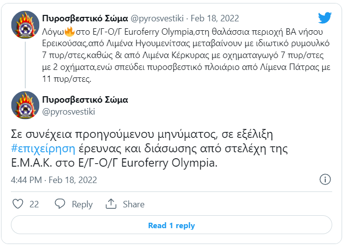 «Η άμεση, γιγαντιαία επιχείρηση έρευνας και διάσωσης, που ξεκίνησε αμέσως μετά την ενημέρωση για το περιστατικό του πλοίου EUROFERRY OLYMPIA είχε ως αποτέλεσμα 278 επιβάτες και μέλη του πληρώματος να διασωθούν και να μεταφερθούν με ασφάλεια στην Κέρκυρα», ανέφερε το απόγευμα σε δηλώσεις του ο υπουργός. Ανέφερε ότι την «ίδια ώρα, συνεχίζονται οι έρευνες για τον εντοπισμό 11 ακόμα ατόμων που αγνοούνται, ενώ πρόσθεσε ότι «η σκέψη όλων μας είναι κοντά τους και κοντά στις οικογένειές τους».