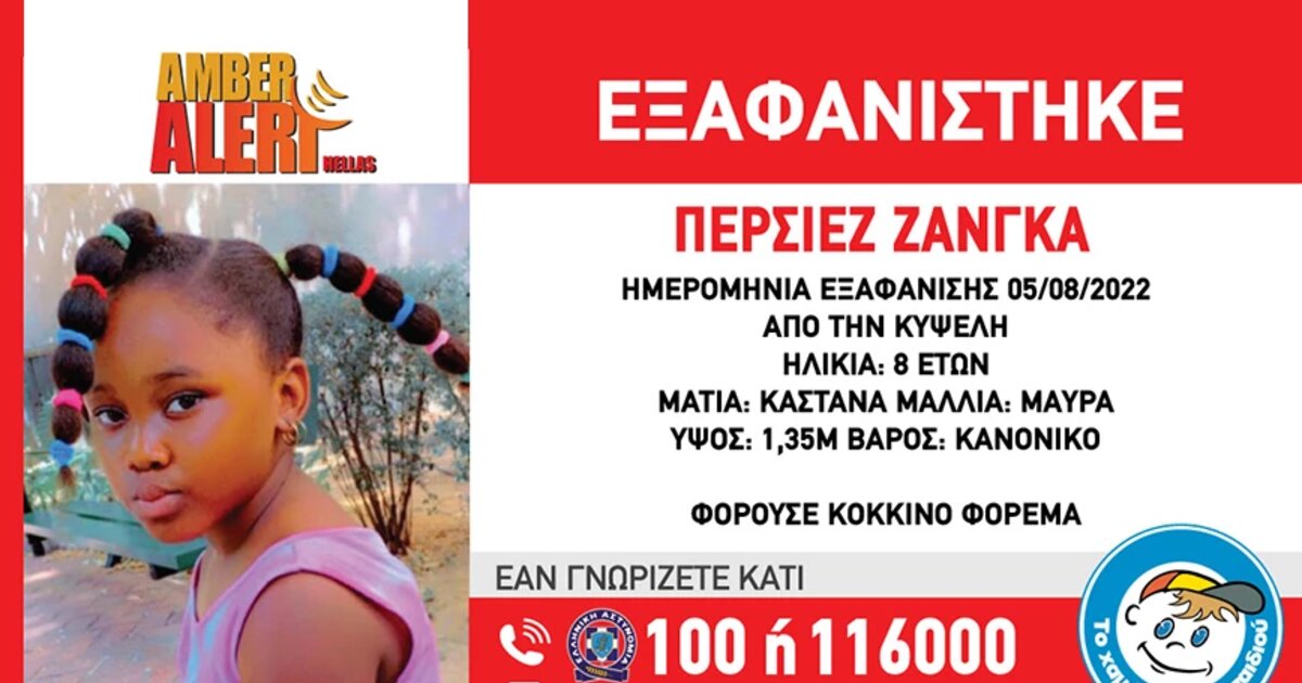 #AmberAlert ΣΥΝΕΧΙΖΕΤΑΙ Η ΑΝΑΖΗΤΗΣΗ ΤΗΣ ΖΑΝΓΚΑ (επ.) ΠΕΡΣΙΕΖ (ον.), 8 EΤΩΝ. Για οποιαδήποτε πληροφορία καλέστε ☎ 116000https://t.co/Ms8UGiKfE9
